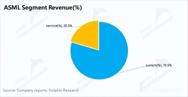 阿斯麦(ASML)的业务由系统销售收入和服务收入两部分构成,其中系统销售收入占比接近 8 成,是公司最核心的收入来源。