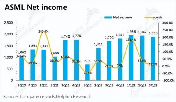 1.4 净利润端:阿斯麦(ASML)在 2023 年第三季度净利润为 18.93 亿欧元,同比增长 11.2%,略超市场预期(18.25 亿欧元)。本季度公司业绩增长主要来自中国大陆客户拉货大幅提升的带来。