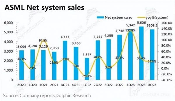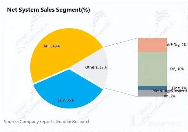 阿斯麦(ASML)的系统销售收入在 2023 年第三季度实现 53.08 亿欧元,同比增长 24.8%。系统销售业务的增长主要来自 ArFi 和 ArF Dry 的大增,两项业务都有超过 50% 的增长幅度。随着中国大陆客户的拉货增加,ArFi 在系统销售业务中占比已经接近 50%,出货均价也提升至 0.8 亿欧元左右。
