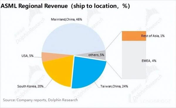 但在细看公司财报后,海豚君认为阿斯麦业绩并没有数据上体现的那么稳定。本季度公司业绩能支撑住的最大一环是,中国大陆的大幅拉货。此前中国大陆的销售占比大多时候基本都维持在 25% 以下。本季度则暴增至 46%,主要来自中国大陆产能扩充带来的拉货需求。