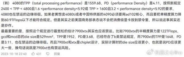 有评论解读认为,按照美国商务部的新规来看,以后出口芯片都要按计算器算一下,芯片的总体性能和性能密度是限制点,因此 RTX 4080 和 AMD 的 7900 XTX 也是有被禁风险的。