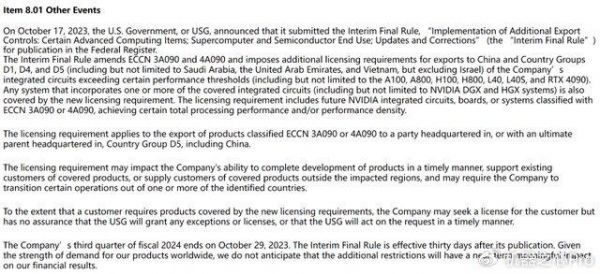 作为上市公司,英伟达立刻提交给美国证监会(SEC)一份报告,主要声明了以下几点:这些限制适用该公司的 A100、A800、H100、H800、L40、L40S 和 RTX 4090 芯片,同时也影响了与这些芯片一起销售的整个系统,包括 DGX 和 HGX 系统。
