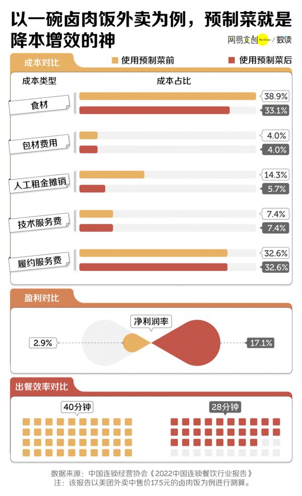 据中国连锁经营协会的估算,一份售价 17.5 元的卤肉饭外卖,如果厨师现场制作,净利润只有五毛钱,而使用料理包,能达到三元,足足涨了五倍 [5]。