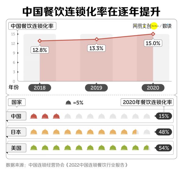 近年来,中餐的连锁化率一直处于上升趋势,虽然没有日本、美国等发达国家高,但发展速度迅猛 [5]。