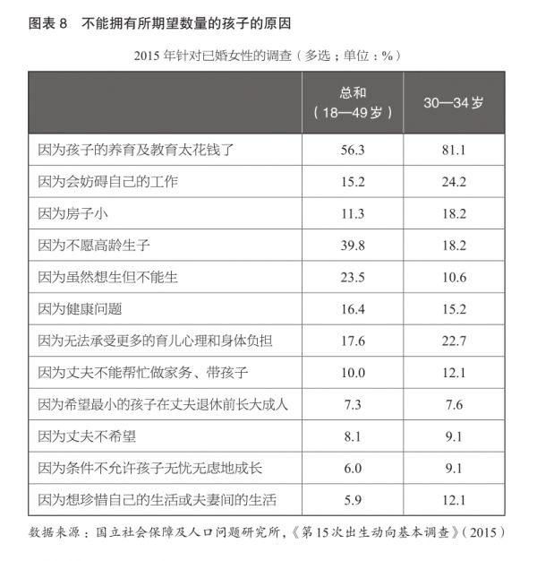 例如,在国立社会保障及人口问题研究所的“出生动向基本调查”中,每次都会向已婚女性提及“理想中的孩子数”和“计划中的孩子数”这两个问题。并对两者之间存在差距的人(例如理想中的孩子数是三人,但计划只生两个等)进行问卷调查,询问了他们“不能拥有所期望数量的孩子的原因”(参照图表8)。