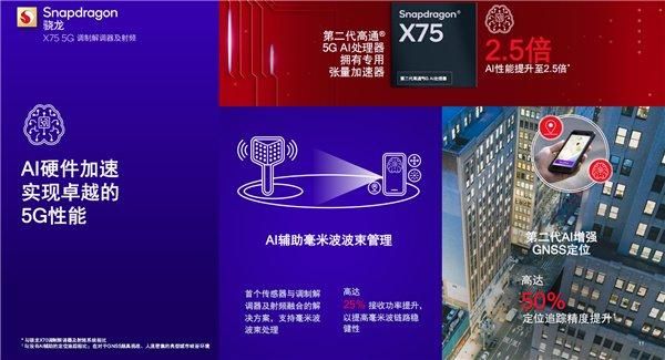 甚至在5G连接方面都引入了硬件加速AI,骁龙X75基带凭借全新的张量处理器架构,AI处理能力提升至前一代的2.5倍以上,实现全球首个传感器辅助的毫米波波束管理(接收功率提升最多25%)、第二代AI增强GNSS定位(提升最多50%),让网络连接性、稳定性等方面都大幅提升。