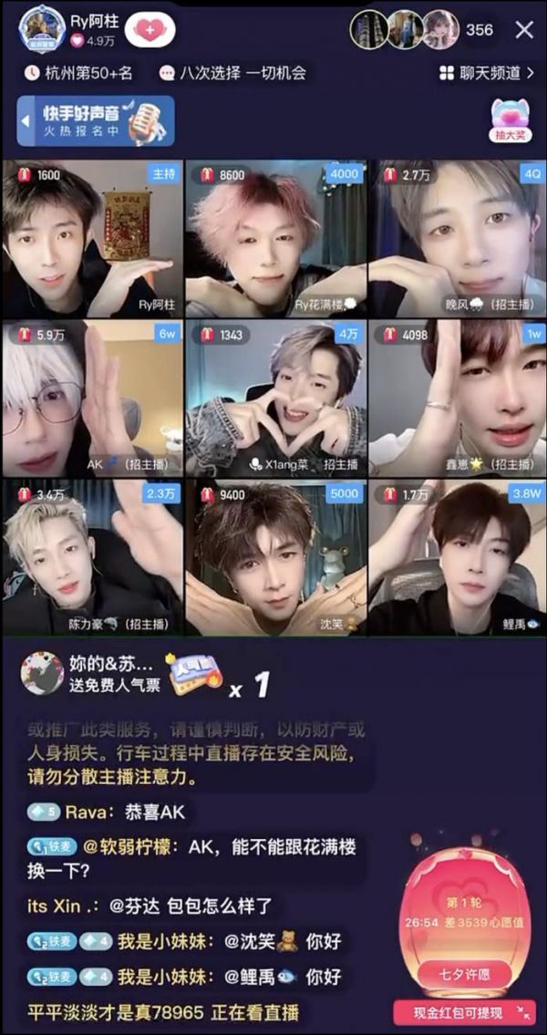 K崽:有两点比较重要的发现,我们进来快手的时候就做了研究,发现帅哥内容在平台上相对较少,平台上的才艺内容很多,但是颜值男主播内容比较缺少。但这一块刚好是我们公会的优势,所以就决定要抓住这个切入点,在快手做男厅。