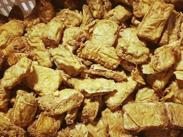 孝感的豆腐底子虽然外形略有些像酿豆腐,却是特殊的“豆腐包豆腐”。将豆腐捣碎,加入佐料、肉末拌匀,用新鲜的油豆皮包好压实,切成菱形块入锅油炸。做豆腐底子多在春节前,炸后耐储存,适合做年菜。与肉丸、排骨等荤菜同煮,吸饱汤汁,更为入味,总是最先被筷子抢光。