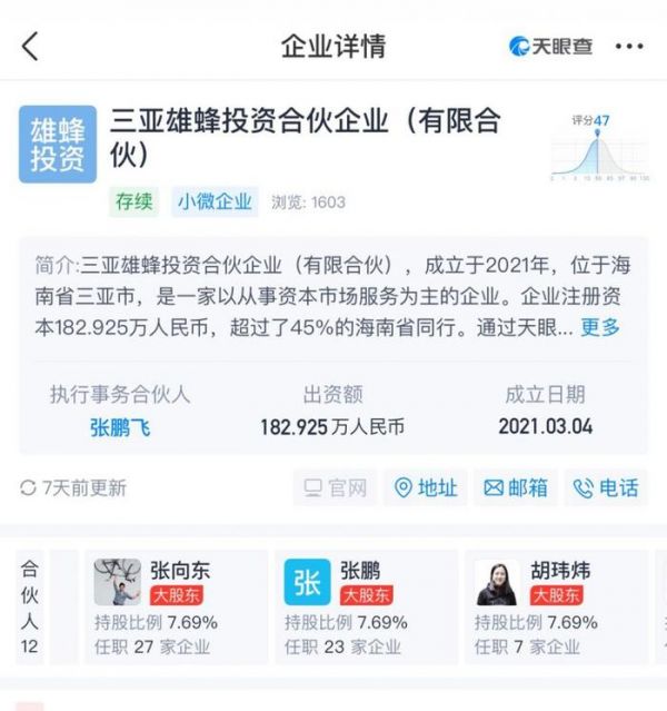 三亚雄蜂投资合伙企业(有限合伙)成立于2021年3月,执行事务合伙人为张鹏飞。胡玮炜持股比例为7.69%。