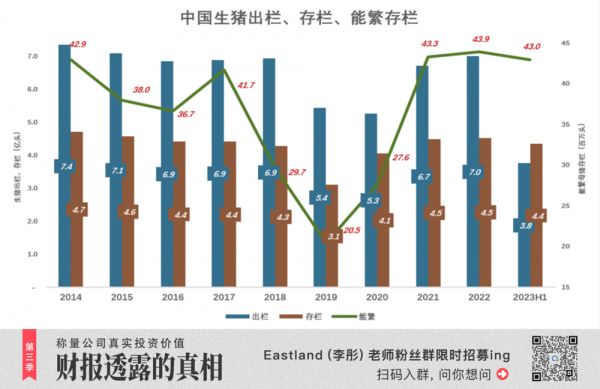 2021年末、2022年末、2023年6月末,能繁母猪存栏量分别为4330万头、4390万头、4300万头。均高于2014年末的水平,与猪肉消费见顶的大势相悖。