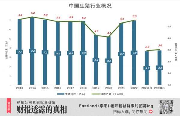 2021~2022年,养猪行业基本恢复到疫情前水平,2022年生猪出栏7亿头、猪肉产量5540万吨。