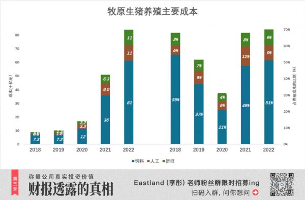 2020年,饲料成本115亿、仅占养殖收入的21%;2021年,饲料成本360亿、占养殖收入的48%;2022年,饲料成本614亿、占养殖收入的51%。