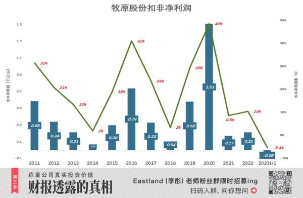 2015年进入下一个周期的左侧(上行),2016年猪肉价格再度走高,牧原销量达3114万头,扣非净利润达23亿,每头净赚739元,净利润率19%。