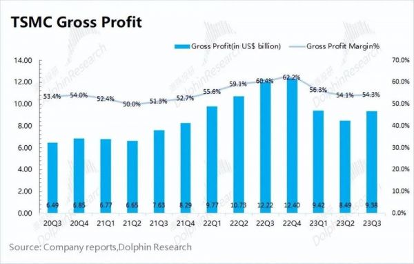 2023Q3台积电的毛利率54.3%,环比提升0.2pct。虽然毛利率好于市场预期的53%,但较此前60%以上的情况有明显的回落。