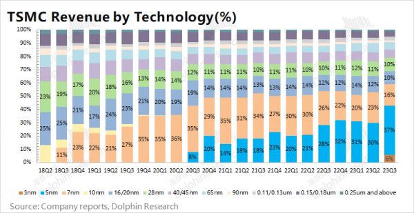 海豚君认为从公司给的下季度指引看,2023Q4公司业绩仍将受益于苹果新机的拉货。从历史来看,3nm产能有望继续爬升至两位数以上。公司的收入结构将进一步转向7nm以下的制程节点。