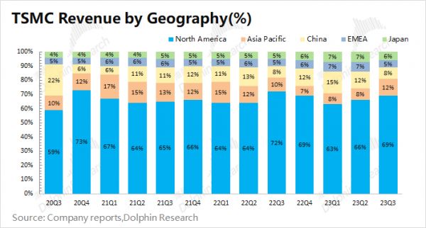 从各地区收入来看,北美地区仍是台积电最大的收入来源。这是由于北美地区有苹果、高通、英伟达、AMD等大客户,使得台积电和美国之间有很强的商业绑定关系。本次财报中,北美地区的收入占比继续回升,这主要是因为苹果新机发布,在本季度新增了订单。
