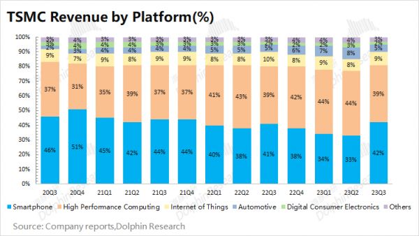 下游细分应用看,智能手机业务的份额回升至42%,这里有苹果新机发布的季节性带动,另外3nm的量产也带动营收增长。高性能计算本季度相对平稳,维持在40%左右的份额。