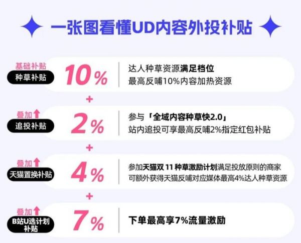 在上述星任务补贴之外,B站不久前还联合阿里妈妈UD内容推出双十一种草反哺激励计划:提供最高21%的现金、流量补贴。其中,参与“全域内容种草快2.0”活动可以获得最高2%红包补贴,参加B站“U选计划”可以获得最高7%流量激励,双方都可以说是下了血本。
