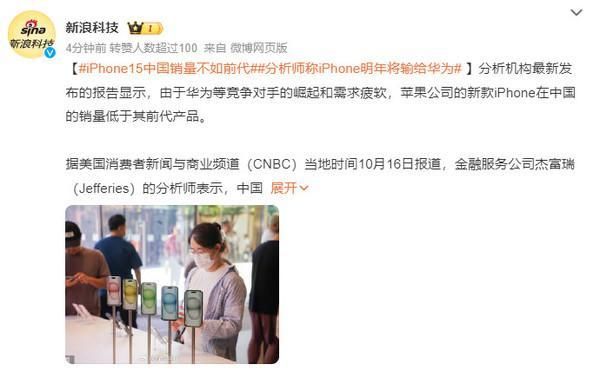 华为 Mate60 系列的发布给苹果手机销量带来了不小的影响。分析机构最新发布的报告显示,由于华为等竞争对手的崛起,加上需求疲软,苹果新 iPhone 在中国的销量低于其前代产品。且分析师认为,这一趋势表明 iPhone 明年将 " 输给 " 华为。