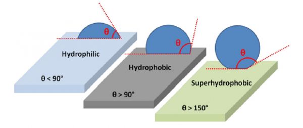 水滴在亲水、疏水和超疏水表面上的接触角。图片来源:文献[5]