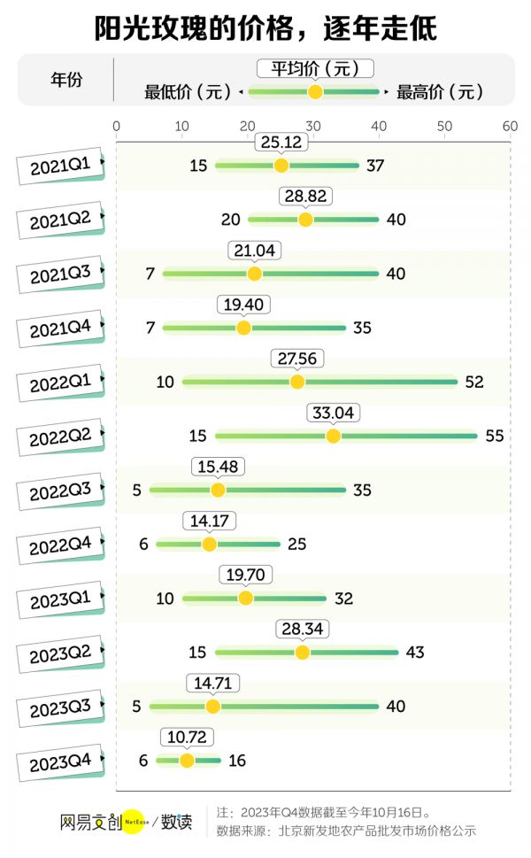 2022 年第二季度,阳光玫瑰的平均价还能达到 33 元每斤,最高价高达 55 元每斤,到了今年,最贵只能卖到每斤 43 元,第二季度每斤均价下降到 28 元 [1]。