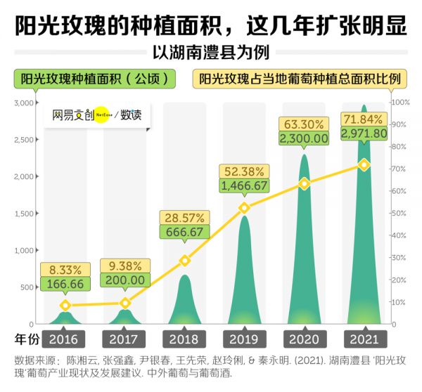 比如在全国最大阳光玫瑰养殖基地湖南澧县,2021 年阳光玫瑰的种植面积几乎是 2016 年的 18 倍,阳光玫瑰在全县各类葡萄种植总面积的占比,从 8.3% 飙升到 71.8% [4][5]。