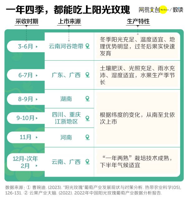 而六月起,两广地区的阳光玫瑰开始成熟、上市。八月之后,由南向北,湖南、四川、重庆、江浙沪地区,以及河南、河北都会陆续完成采摘,让阳光玫瑰的上市一直持续到 11 月初 [2][7]。