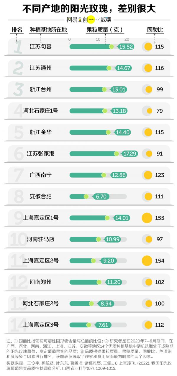 他们发现,在果粒果穗质量、果实甜度、色泽等方面,不同基地的差异很大,其中江苏句容和通州的果实表现最好,石家庄的阳光玫瑰固酸比还没有上海嘉定的一半高 [11]。