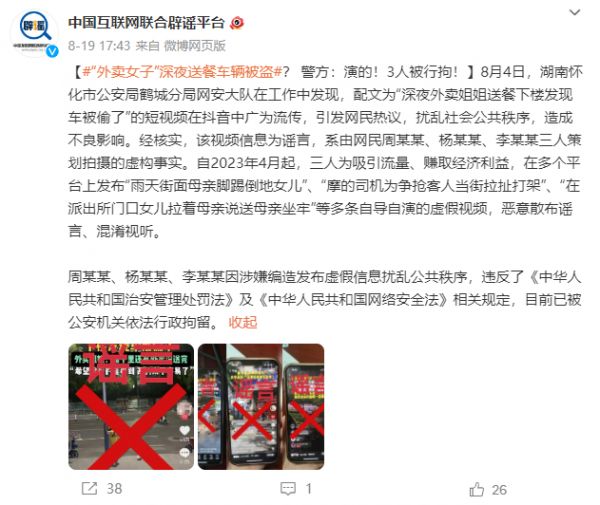 “深夜送餐车被盗”被官方辟谣,相关苦情剧本制作者被行政拘留