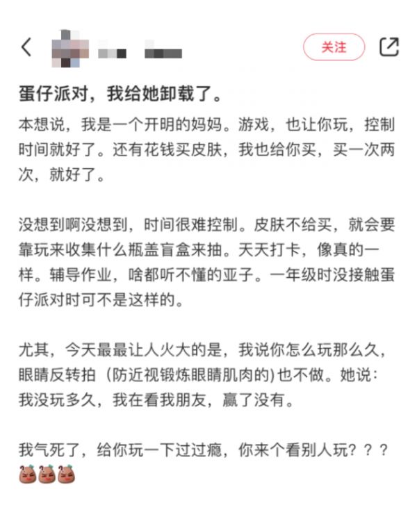 图 | 小红书上一位小学生家长对“蛋仔派对”的吐槽