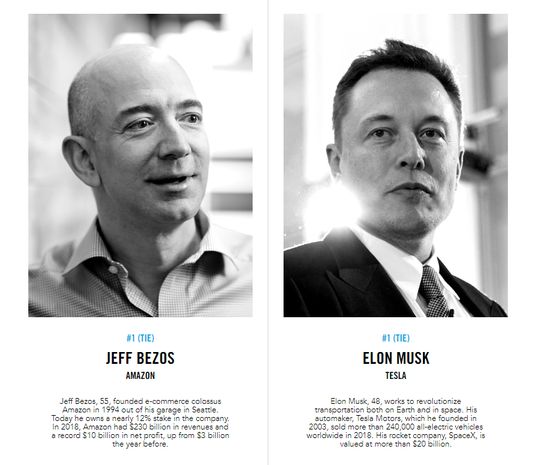【环球网科技报道 记者 林迪】日前,美国《福布斯》发布2019美国最具创新力领袖榜单(以下简称为“榜单”),榜单显示,大型科技公司的创始人或首席执行官占据了榜单前十位置。其中,亚马逊创始人杰夫·贝索斯(Jeff Bezos)与特斯拉首席执行官伊隆·马斯克(Elon Musk)并列榜首。