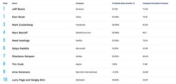出排名第一的贝佐斯与特斯拉之外,其他前十的科技公司领袖还有:Facebook创始人马克·扎克伯格,位列第三名;Salesforce首席执行官马克·贝尼奥夫,位列第四名;Netflix创始人里德·哈斯廷斯,位列第五名;微软首席执行官萨提亚·纳德拉,位列第六名;苹果首席执行官蒂姆·库克,位列第八名;谷歌联合创始人拉里·佩奇和谢尔盖·布林,位列第十名。