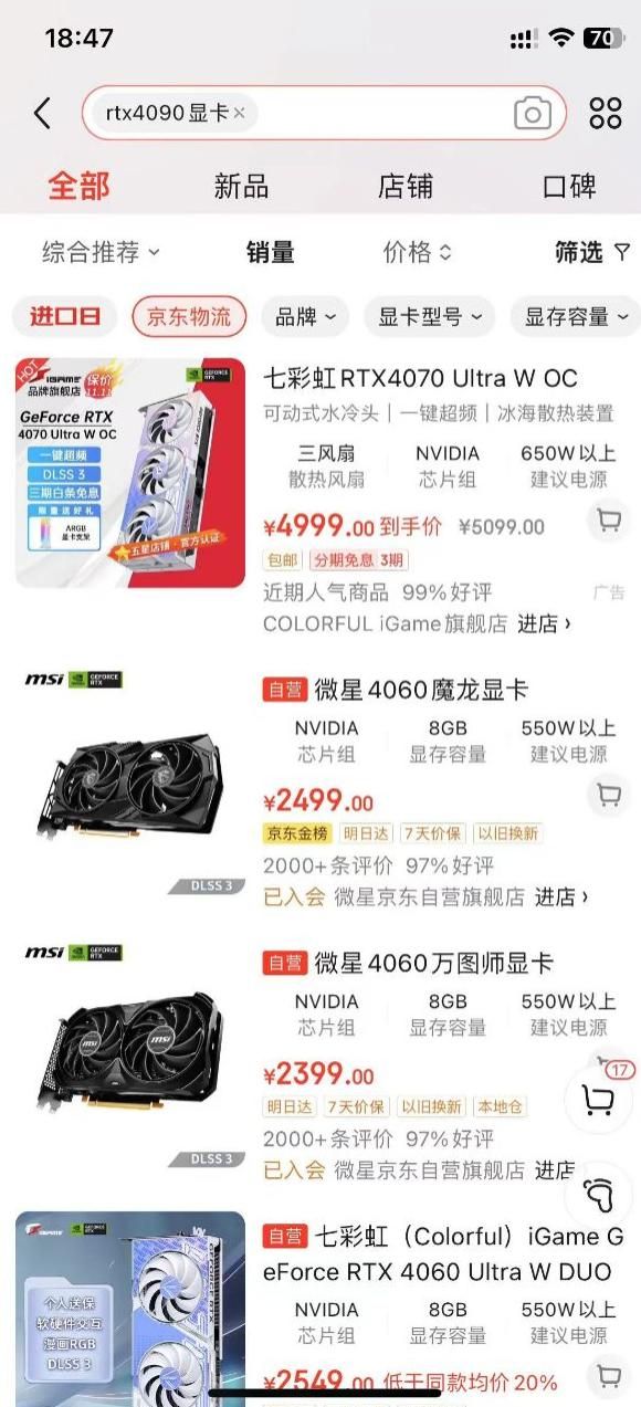 据英伟达公司向美国证券交易委员会提交的最新公开文件,美国政府已经发布更新和修正后的临时最终决定。受管制的包括但不限于 NVIDIA A100、H100、A800、H800、L40、L40S、RTX 4090 以及集成这些高性能计算卡的 DGX/HGX 系统。值得注意的是此次美国政府竟然将消费级产品也就是RTX 4090也添加到出口控制,实行RTX 4090对华禁售。其中 A100/H100 是英伟达性能最好的计算卡、A800/H800 是英伟达故意砍性能以便能够向中国企业出口的限制版本。但最让人想不到的是 RTX 4090 这款消费级显卡也被禁售,这是目前性能最好的消费级显卡,这将导致游戏玩家和视频创作者都受影响。因此即便用户购买这款显卡只是拿来玩游戏、进行视频渲染等,后续可能也无法通过正常途径正常价格购买。目前RTX4090公版/非公版显卡陆续下架,店铺均为无货状态。多个渠道的4090均出现“跳价”现象。目前在京东已经全面无货,搜索 RTX 4090 仅显示 RTX 4070 等其他型号的显卡: