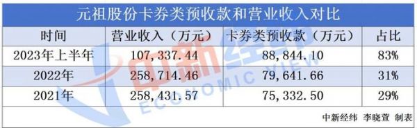 烘焙食品上市公司元祖股份 2023 年半年报显示,上半年公司卡券预收款的金额高达 8.89 亿元,而其营业收入为 10.73 亿元,卡券类预收款占比超 83%。其 2022 年年报显示,该公司全年营业收入为 25.87 亿,卡券类预收款为 7.96 亿,占比超 30%,这一数字在 2021 年为 29%。