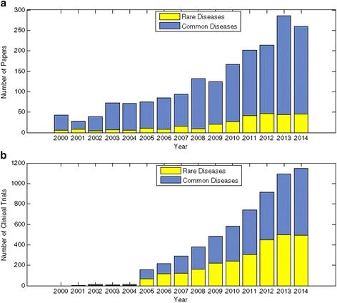 不过国内对于罕见病的研究是有不断上升,甚至赶上常见病的趋势的,上图是研究文章的发表数量,下图则是临床实验的数量 | 图源:Yang L, et al.2015.