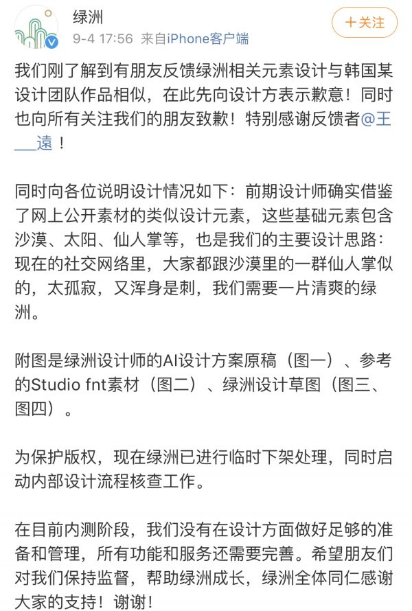 在9月4日晚间的微博声明中,“绿洲”阐述其设计理念称:“前期设计师确实借鉴了网上公开素材的类似设计元素,这些基础元素包含沙漠、太阳、仙人掌等,也是我们的主要设计思路:现在的社交网络里,大家都跟沙漠里的一群仙人掌似的,太孤寂,又浑身是刺,我们需要一片清爽的绿洲。”