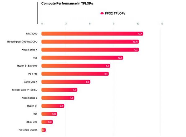 AMD Ryzen Threadripper PRO 7995WX CPU 不仅在原始 TFLOP 方面领先于两款游戏机,而且和英伟达 GeForce RTX 3060(12.7 TFLOP)相当。