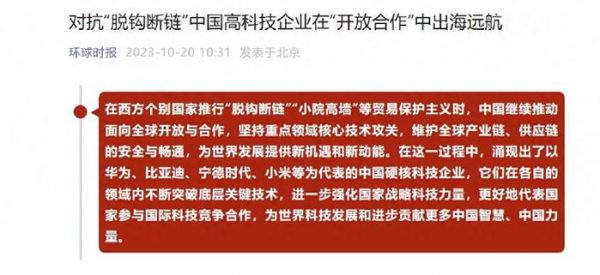 人民网:要着力强链补链、攻克关键核心技术,真正带动国产供应链企业走向全球。比如,华为、小米、宁德时代、比亚迪等中国硬核科技企业,在全球科技创新中起到领先领跑的作用。
