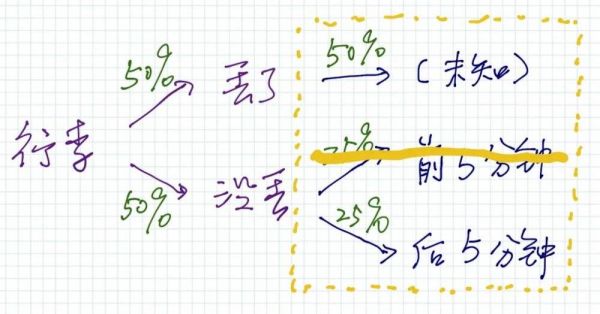 首先,用直觉快速解答一下:假设行李没丢,概率是50%,目前还有5分钟,也就是还有50%机会等到行李,那么是不是应该是(50%×50%=25%)呢?然而,这个解答是错的。