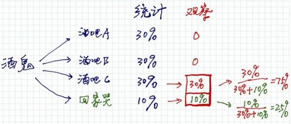 酒鬼去每个酒吧的概率都是30%,这是一个统计结果,也就是说过去100天,酒鬼有30天去酒吧A,30天去酒吧B,30天去酒吧C,10天回家被老婆骂。