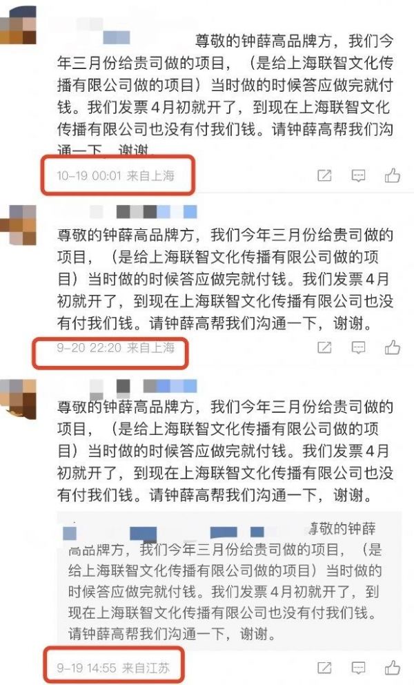 钟薛高官方微信上一次更新停留在8月11日,发布内容仍为推荐联名新品,发布跨界合作的消息。官方微博的更新日期则停留在8月22日,该微博下方还有疑似合作方讨要执行费用,并表示:“3月份给贵司做的项目,发票4月初就开了,现在也未付款。”