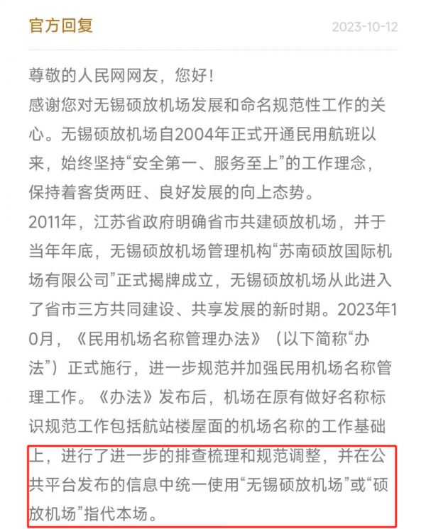 目前机场正按照新规对接民航局相关管理单位做好更名的相关准备工作……并在公共平台发布的信息中统一使用“无锡硕放机场”或“硕放机场”指代本场。