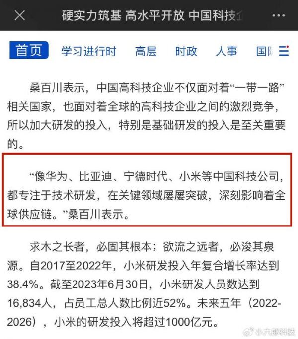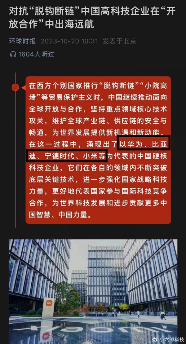 环球时报在一文《对抗“脱钩断链”,中国高科技企业在“开放与合作”中出海远航》同样提及了华为、比亚迪、宁德时代和小米等中国硬核高科技企业,并且对它们不断突破底层关键技术,加强国家战略科技力量等等,都表示赞扬。