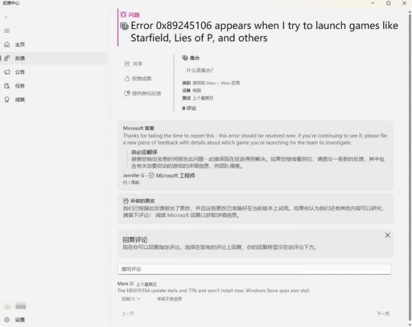 一位受影响的用户在微软反馈中心称:“当我尝试启动《星空》《匹诺曹的谎言》等游戏时,会出现错误代码 0x89245106。”