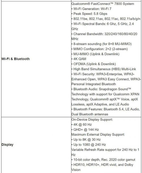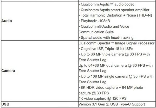 上面的图片还显示了最大内存支持、相机、显示屏和其他细节,其中值得注意的是 USB 版本,为 3.1 Gen 2,最大带宽为 10Gbps,这意味着配备骁龙 8 Gen 3 并支持上述规格的 Android 旗舰手机可以像 iPhone 15 Pro 和 iPhone 15 Pro Max 一样连接外部显示器进行游戏。