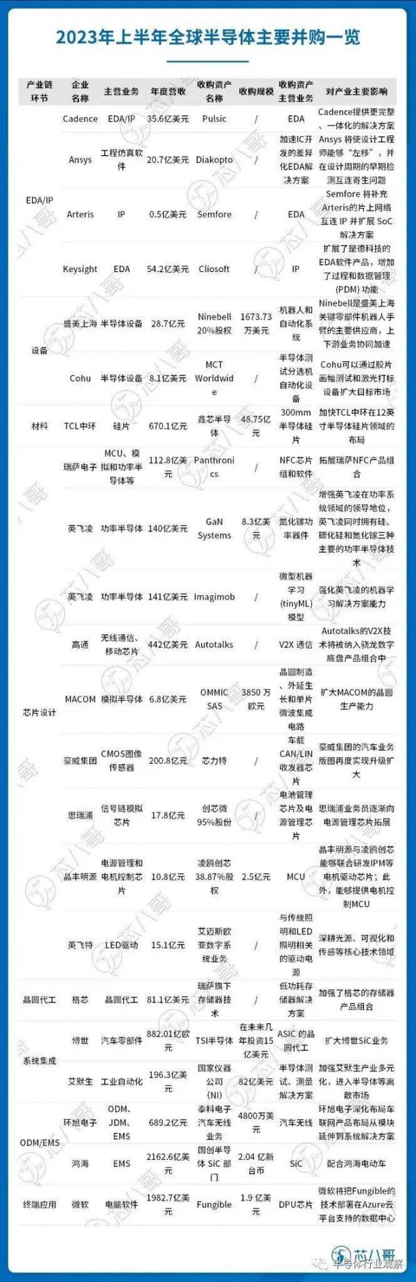 根据芯八哥数据不完全统计,2023上半年全球半导体行业进行了多笔并购: