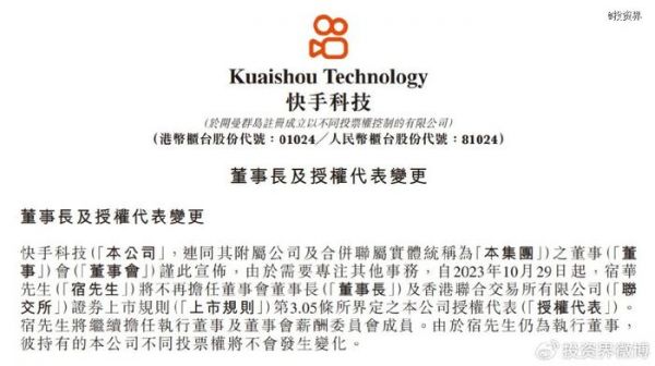 直到最新一幕,宿华正式辞任董事长一职。公告显示,自2023年10月29日起,宿华不再担任董事会董事长,将继续担任执行董事和薪酬委员会成员,其不同投票权不会发生变化。而宿华表示,将继续致力于为集团创造长期价值,并相信集团有坚实的基础实现战略目标。