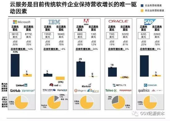 为什么这些巨头如此舍得花钱买公司呢?事实上,传统软件巨头Microsoft、Oracle、IBM、Adobe和SAP的非云业务收入都几乎毫无增长,只有云相关的业务却迅猛上升。大企业内部创新极难,传统软件思维的团队面对云软件的侵蚀,必须毫不犹豫地大力收购。