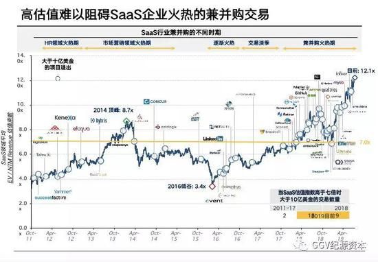 再看并购市场。2014年, Concur以80亿美金估值卖给SAP,这一价格史无前例,在当时轰动了行业。而就算是这样的价格,也只是以10倍收入来估值。交易历史中有最高估值乘数的12个交易中,有10个是在2018年及以后完成的。