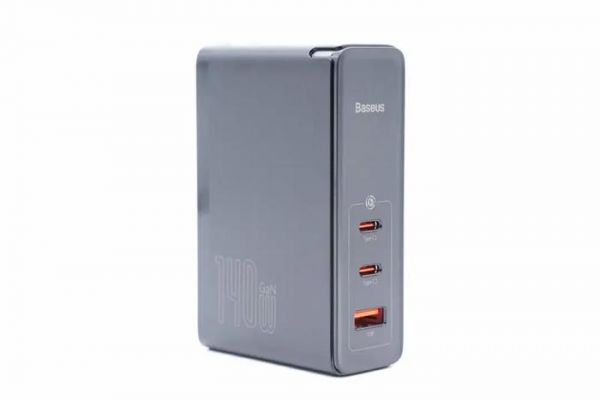充电器延续了倍思120W氮化镓快充一样的接口配置和外观设计,可以说是性能加强版,以满足苹果用户140W快充、外带和多设备同时充电多应用场景需求。充电器通体黑色,机身外壳以磨砂为主,同时上下边缘亮面进行撞色点缀,避免单调,正面印有140W GaN字样,表明这是一款140W氮化镓充电器,非常直观。